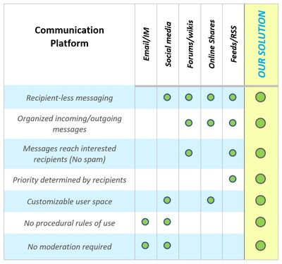 Most communication systems are not designed to handle messages which do not have a clear audience, need to reach multiple audiences, or have no existing communication strategy in place. These messages may go unsent or blasted as global messages. Valuable information lost, misunderstood, delayed or too late.